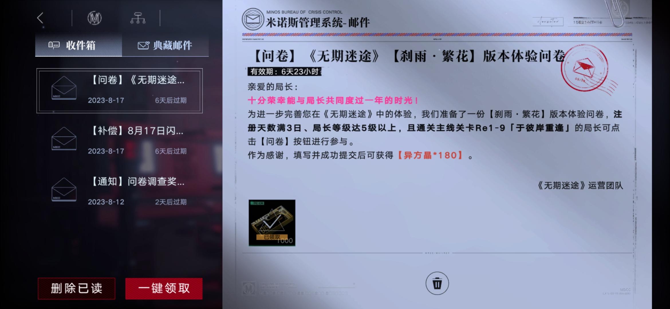 无期迷途怎么回事,他任务让我做任意两次审查,我都做三次了他就是不给我显示任务完成