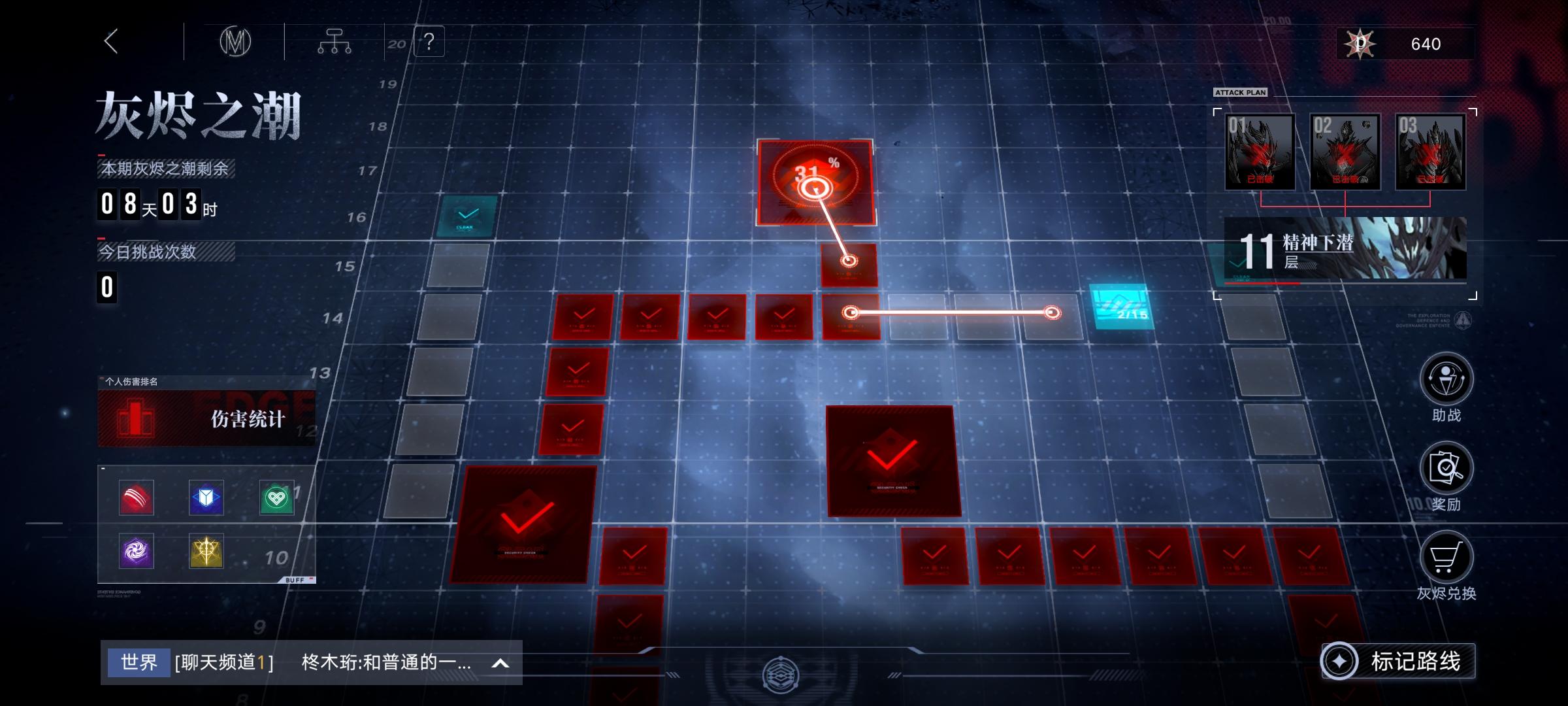 第二天打到了11层,大伙都挺给力的,我却掉了链子...模拟战不会显示挑战中,而显示有人在挑战的时候,其他人不要一起打!!!如果两个人伤害加起来超过了boss血量的话,会撞刀卡掉伤害,超出boss血量部分会被吞,且两个人都没有补偿刀,血亏!我脑子出了问题,撞了一刀展望一下能打通40层吧(大半夜郁闷得睡不着)