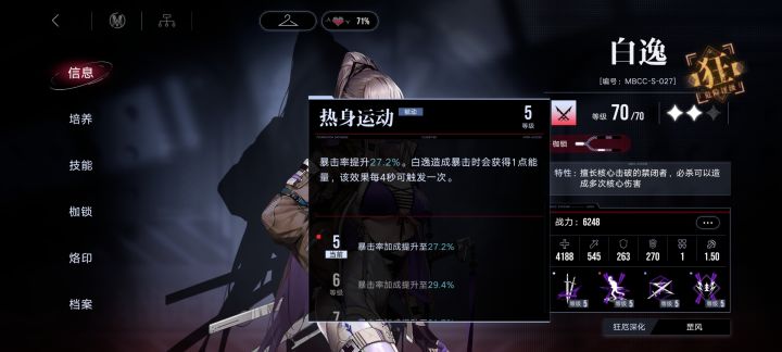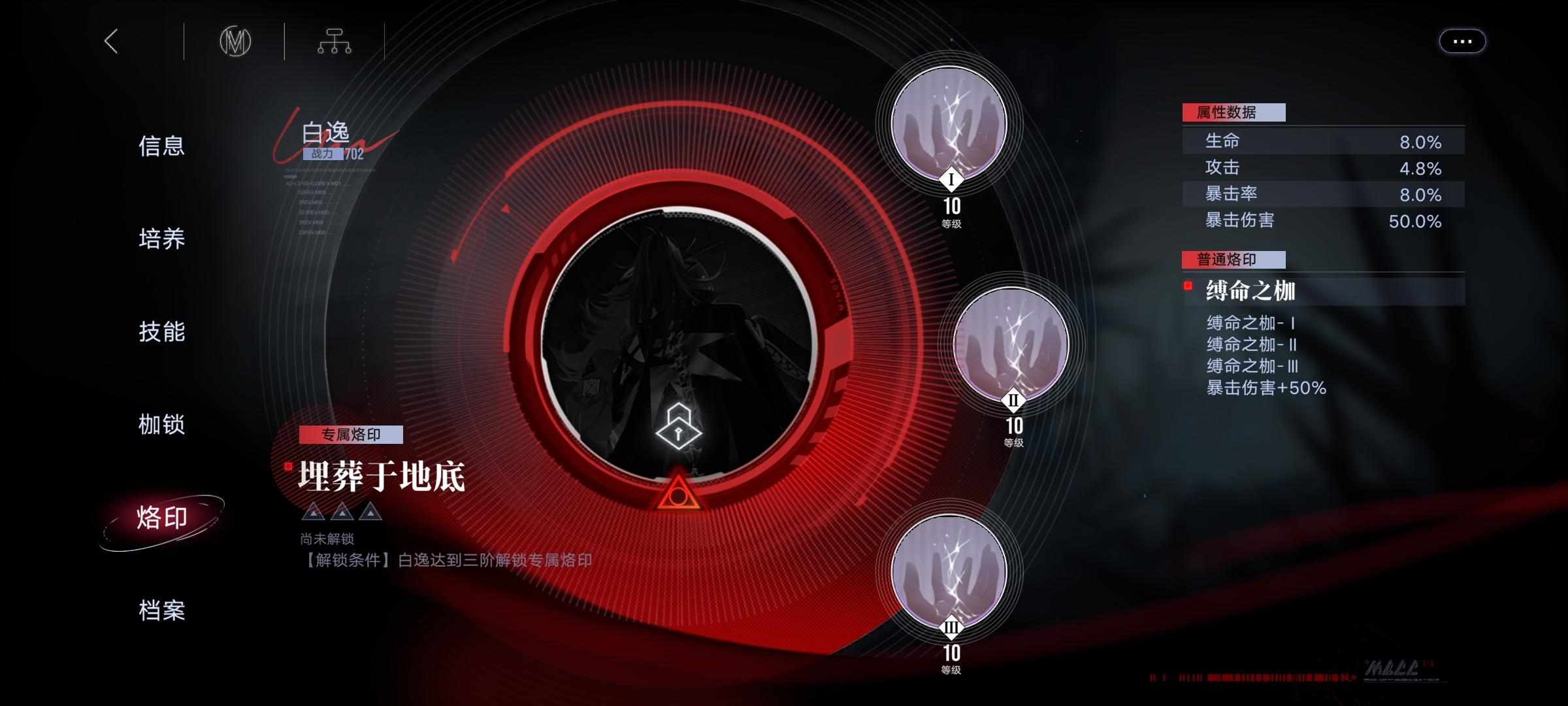 如图,烙印暴击率8 被动技能27 枷锁8结果属性面板还是8 她这是只有8还是我们自己算……最后那个专属烙印,到100%溢出后+攻击,这怎么到,我算了下到70就不错了。白逸我想走纯暴击路线的,暴击率至少得上个50吧