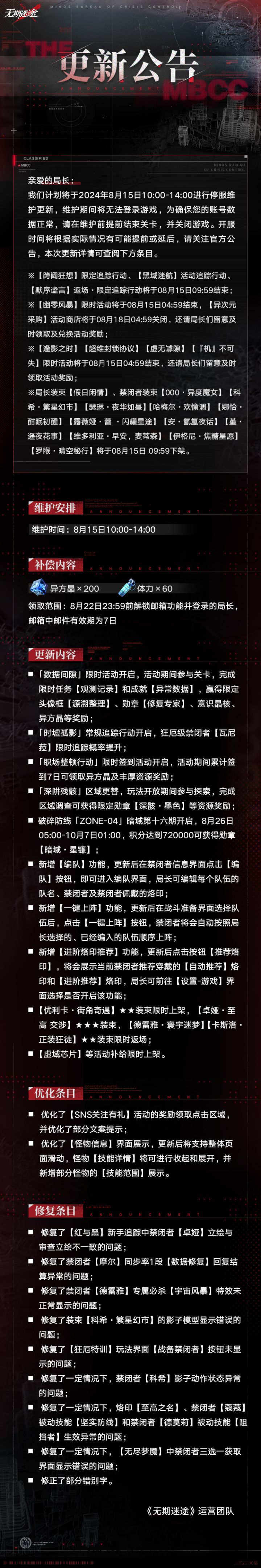 亲爱的局长:我们将于8月15日18:15进行闪断更新,重登游戏即可加载更新内容,详情可查阅下方条目。给局长们带来的不便深感抱歉,感谢大家的理解与支持。〓修复条目〓■修复了【无尽梦魇】中,【铭刻选择】界面无法确认选择的问题;■修复了【烙印预设】中,长按拖拽无法自定义排序的问题;■修复了一定情况下,【编队】中的禁闭者烙印穿戴状态显示异常的问题;〓补偿内容〓闪断更新补偿:异方晶×100领