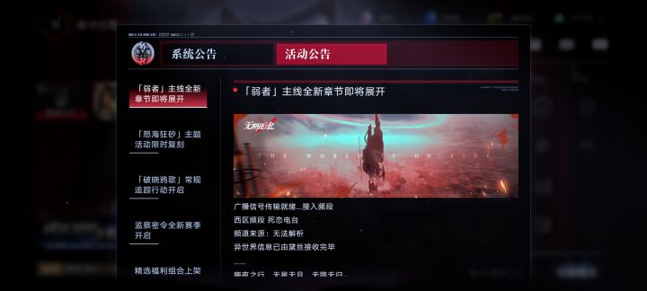 亲爱的局长: 我们计划将于11月16日15:00-15:10进行闪断更新,届时将造成强制掉线,无法登录等问题,重登游戏即可加载更新内容,详情可查阅下方条目。给局长们带来的不便深感抱歉,感谢大家的理解与支持。〓更新条目〓■「烬火终局」限时活动开启,活动期间使用活动代币【余烬印记】解锁区块,全部区块解锁可获得限定头像框【烬火复燃】、异方晶等资源奖励;■监察密令新增烙印预告:下期监察兑换商店【监