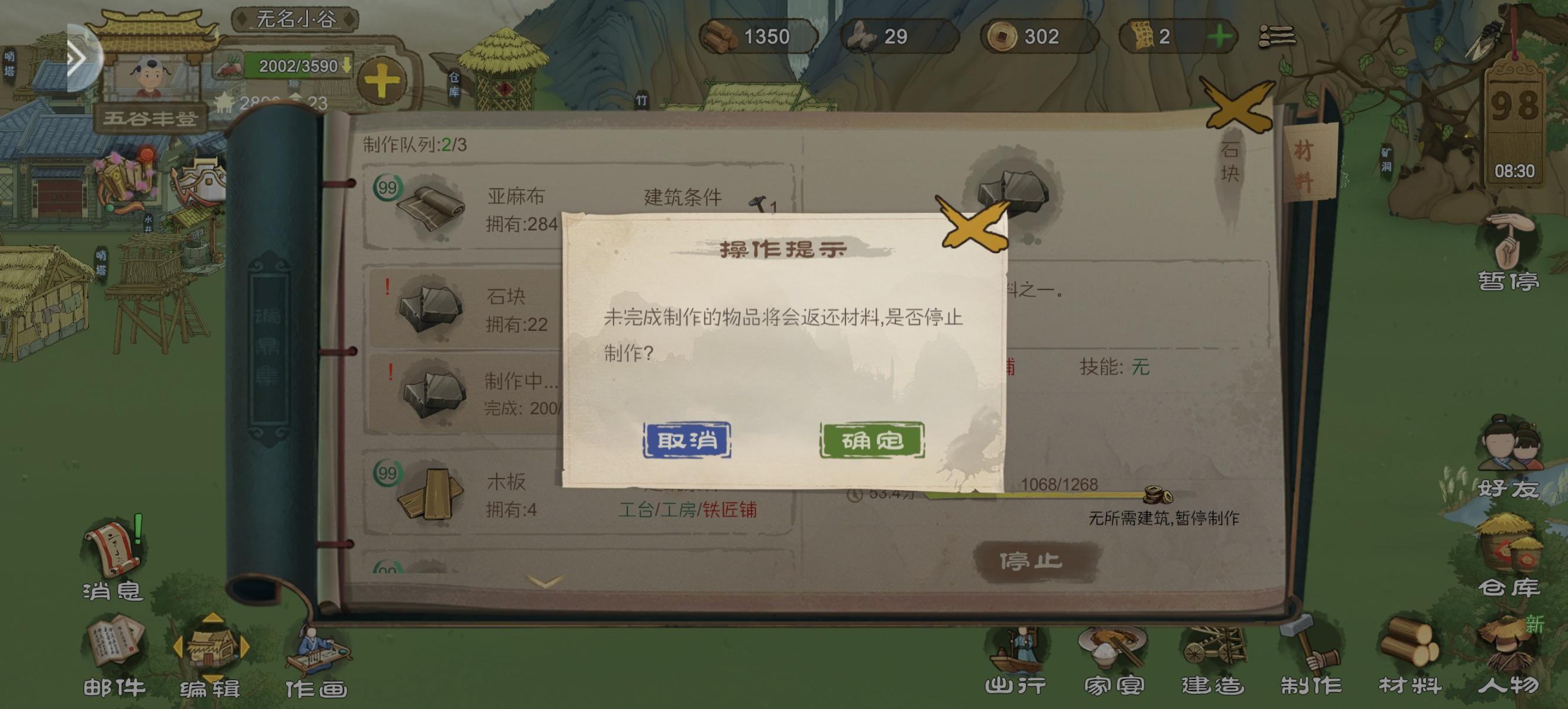 没有建筑暂停制作返还材料点了没有返还,应该是个小bug还有那个衔接过来做事的,就是继续延续做事那个是漂移的走的还有晚上的衔接,有时候会卡顿,选人做事的时候,有时候也会卡顿,不知道是设备问题还是游戏
