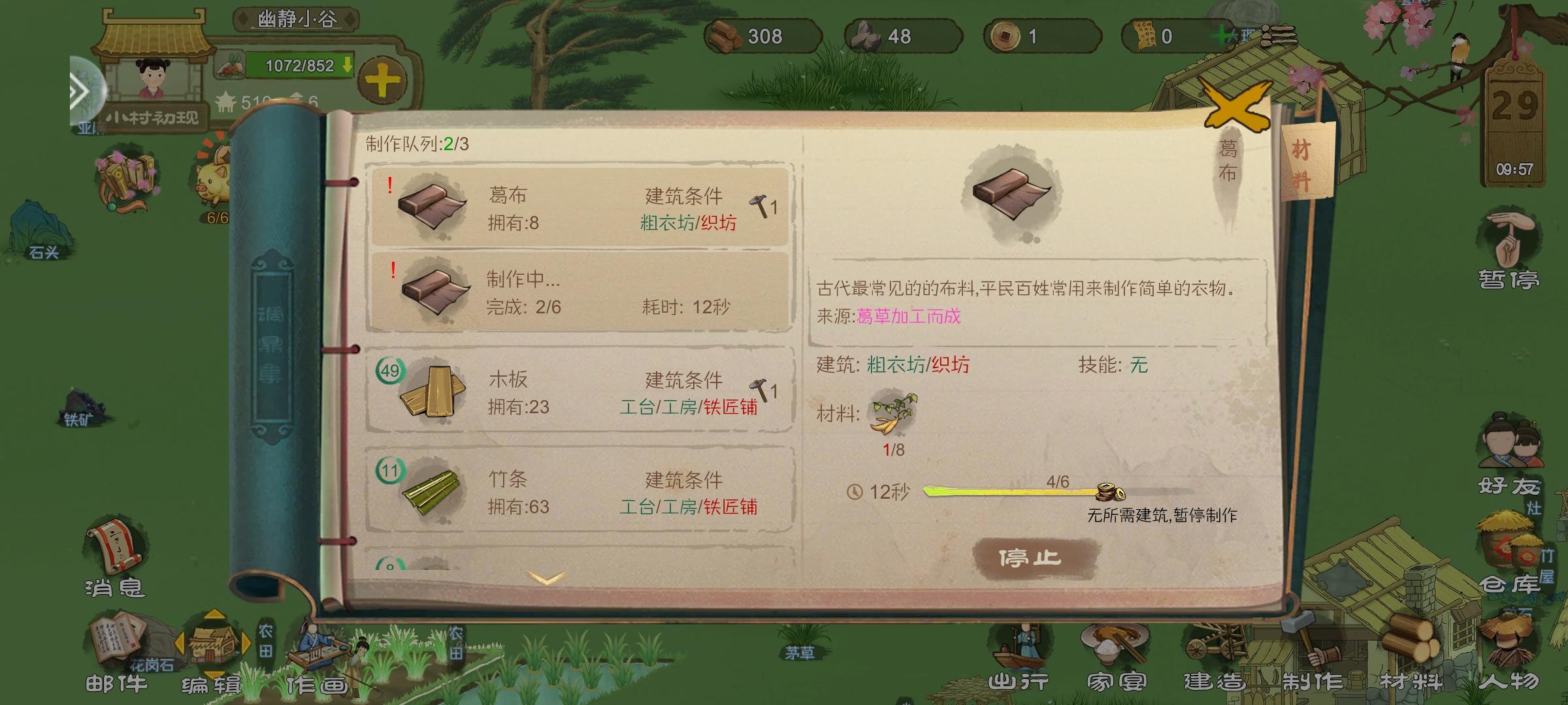 修一下这个bug吧,我做葛布的时候把粗布坊拆了,就显示没法做,这正常,后面又做好了粗布坊,还是卡主,一直站着位置,没办法停止也没办法继续做😭😭