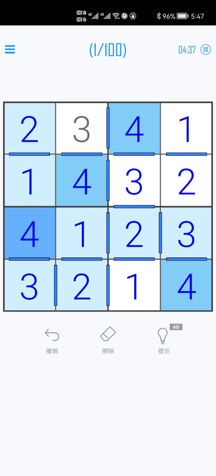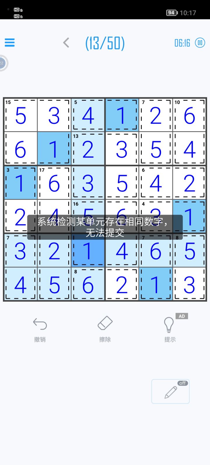 太多题目有多解了。题目完成的检测是匹配其中题库标答而不是验证数独完成。所以打了几关后反复出现需要输入几种正确答案以寻找题库答案的经历。玩得很烦躁,完全没法放松了。卸载了抱歉