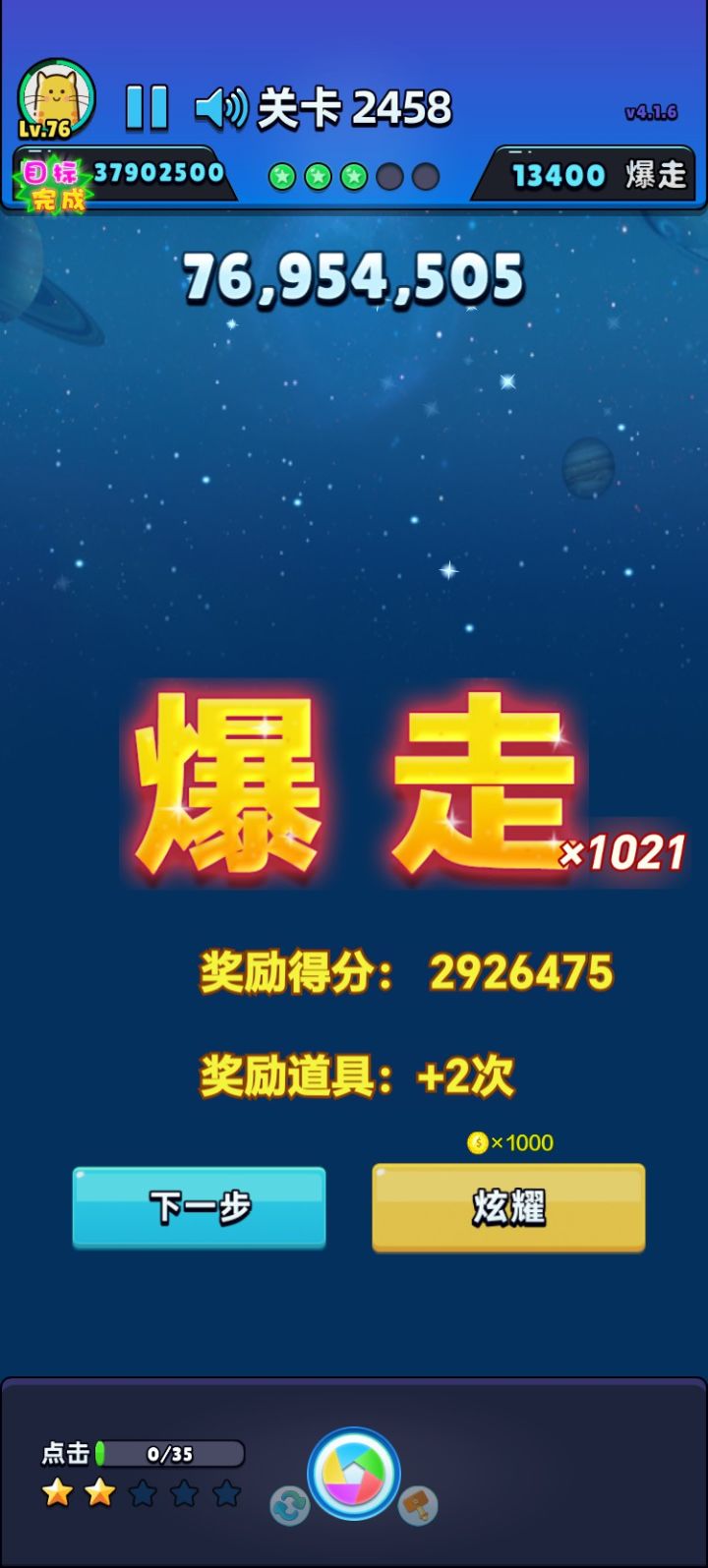 #单机游戏 #游戏推荐 我消除了所有星星,完成第2237次爆走了!!!获得2285230分奖励!