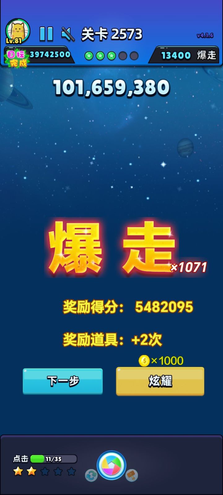 我消除了所有星星,完成第1次爆走了!!!获得3125分奖励!#单机游戏 #游戏推荐