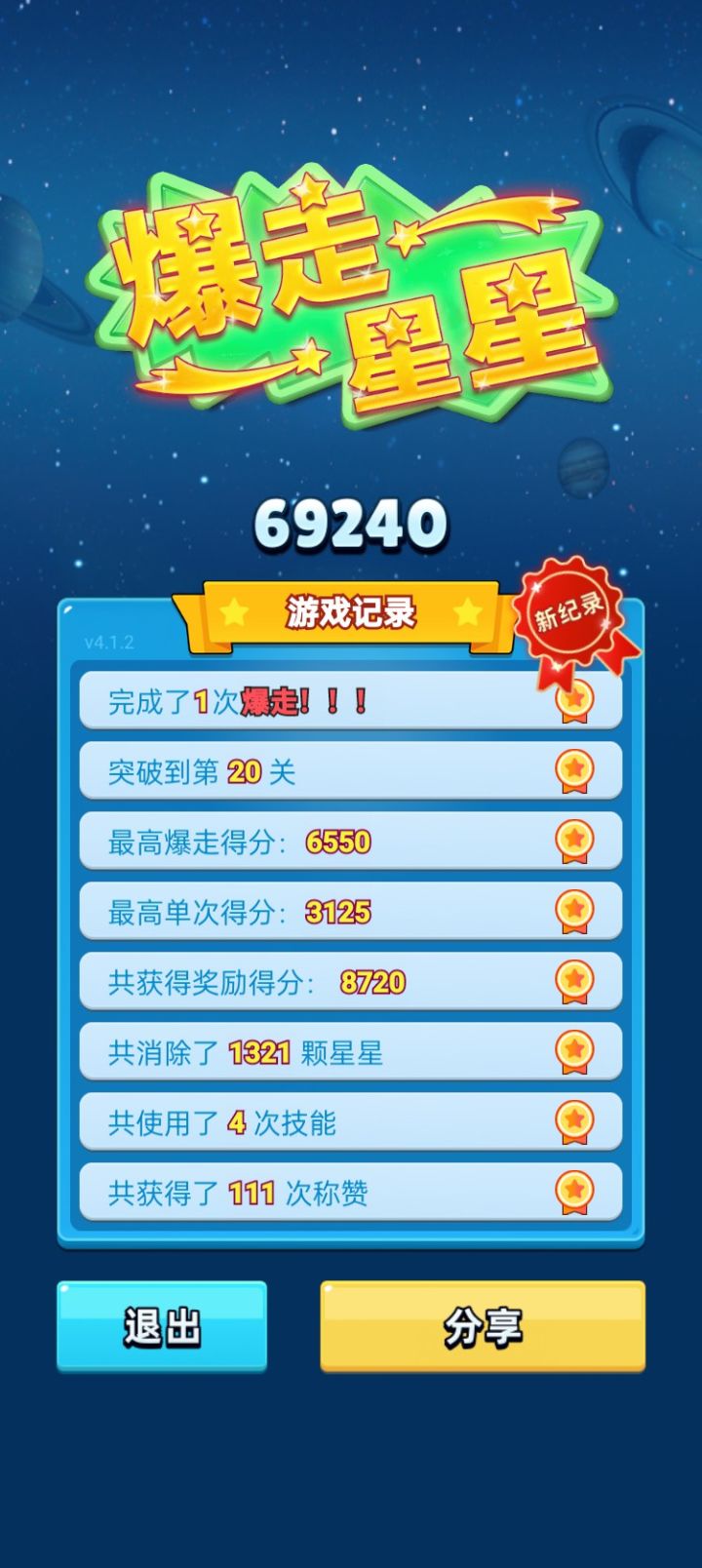 新纪录!!!获得历史最高69240分,突破到了第20关。一共完成了1次爆走!!!最高爆走得分6550。最高单次得分:3125。共消除了 1321 个星星。共使用了 4 次技能。共获得了 111 次称赞。#单机游戏 #游戏推荐