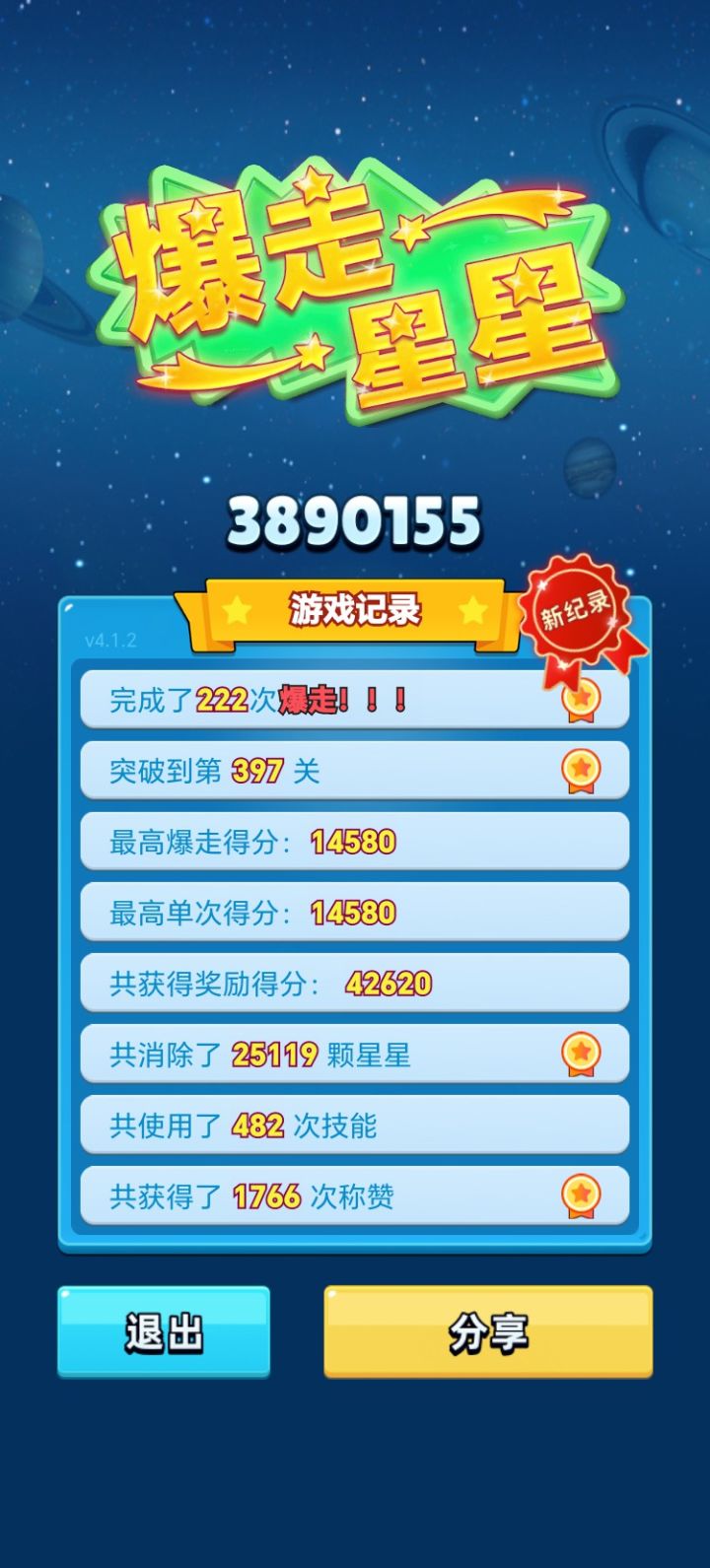 新纪录!!!获得历史最高3890155分,突破到了第397关。一共完成了222次爆走!!!最高爆走得分14580。最高单次得分:14580。共消除了 25119 个星星。共使用了 482 次技能。共获得了 1766 次称赞。#单机游戏 #游戏推荐