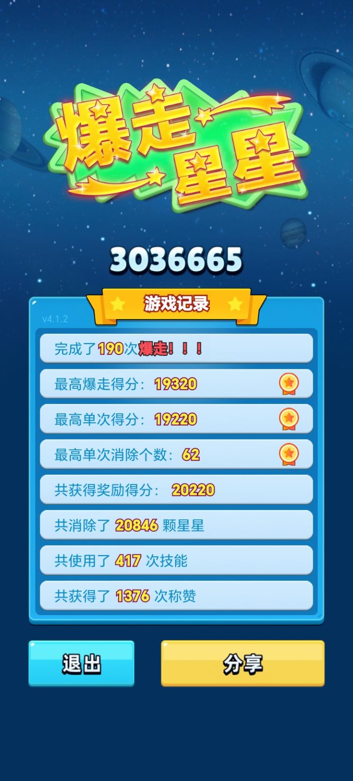 本次获得3036665分,闯到了第330关。一共完成了190次爆走!!!最高爆走得分19320。最高单次得分:19220。共消除了 20846 个星星。共使用了 417 次技能。共获得了 1376 次称赞。#单机游戏 #游戏推荐