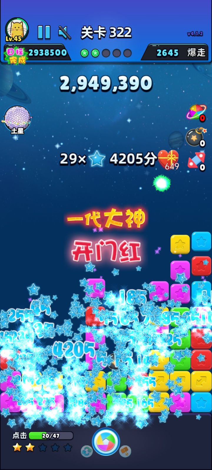 新纪录!!!获得历史最高3927375分,突破到了第400关。一共完成了223次爆走!!!最高爆走得分19360。最高单次得分:19360。共消除了 24478 个星星。共使用了 503 次技能。共获得了 1780 次称赞。#单机游戏 #游戏推荐