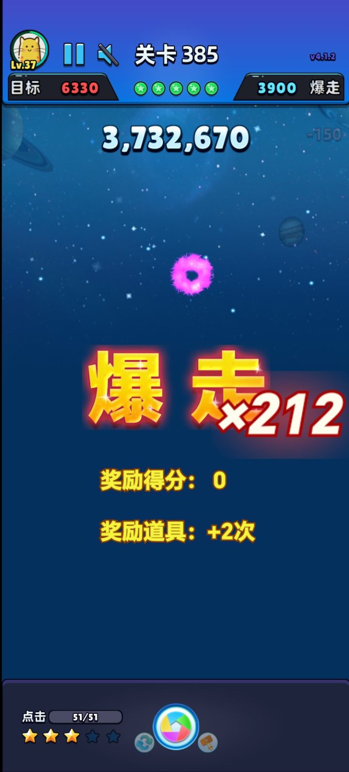 新纪录!!!获得历史最高3736570分,突破到了第385关。一共完成了212次爆走!!!最高爆走得分17020。最高单次得分:16820。共消除了 24519 个星星。共使用了 491 次技能。共获得了 1577 次称赞。#单机游戏 #游戏推荐