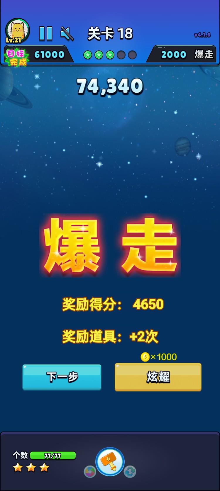 我消除了所有星星,完成第21次爆走了!!!获得4650分奖励!#单机游戏 #游戏推荐