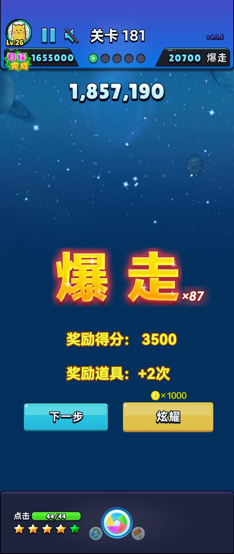 我消除了所有星星,完成第182次爆走了!!!获得3650分奖励!#单机游戏 #游戏推荐