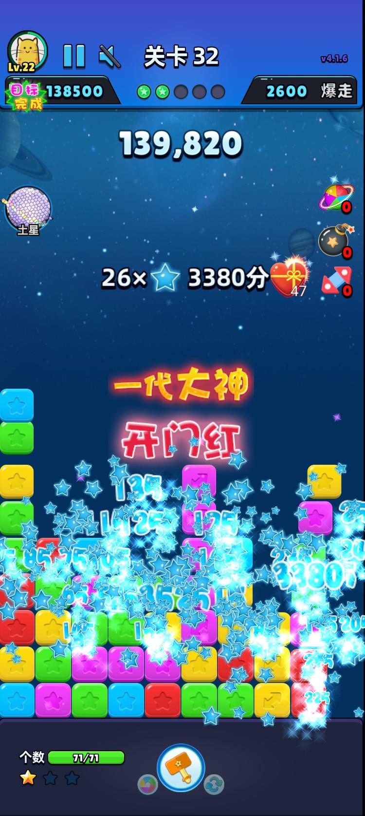 新纪录!!!获得历史最高271400分,突破到了第50关。一共完成了14次爆走!!!最高爆走得分5760。最高单次得分:5760。共消除了 4346 个星星。共使用了 83 次技能。共获得了 238 次称赞。#单机游戏 #游戏推荐