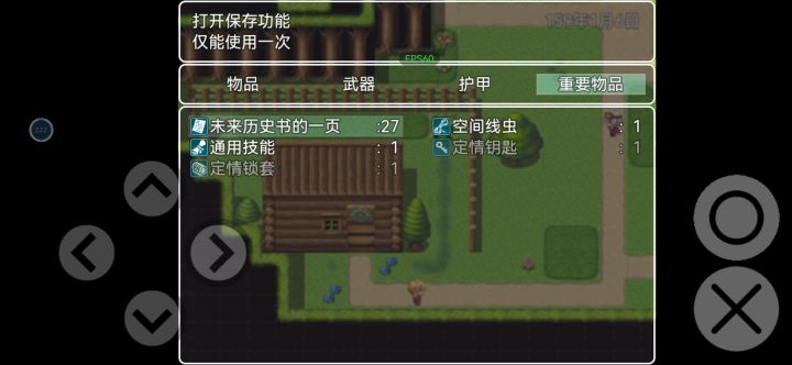 这游戏想随时保存是需要道具的,也就是“未来页”走到地图左下角的房间,进门左手边粉色头发的女生对话:先选2、再选1做我女朋友、她会给你废纸让你丢掉。就是保存道具“未来页”共28份。对话后,可以找她免费保存。在野外想存档就要用未来页,有钱了去装备技能大厅,右侧最上面那里可以买“未来页”5块一个。