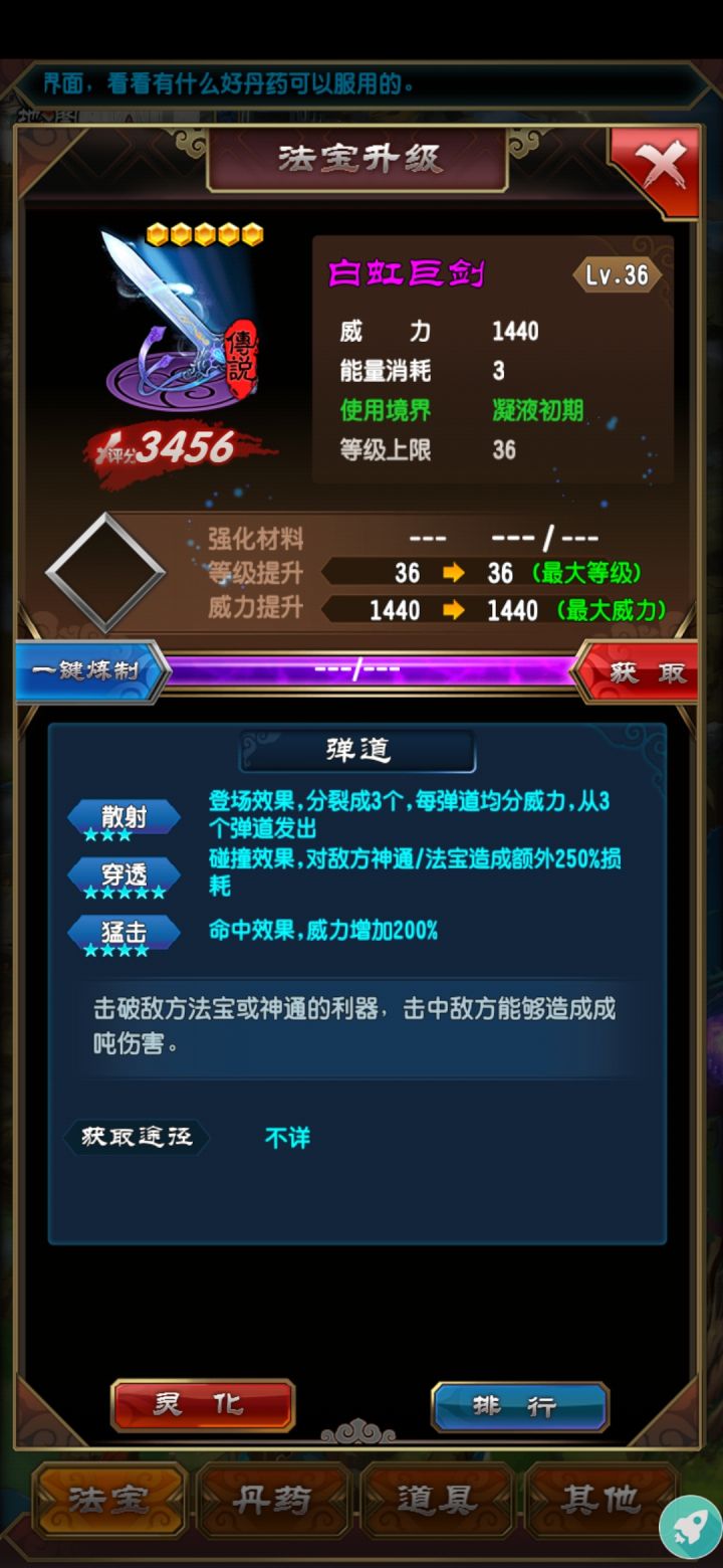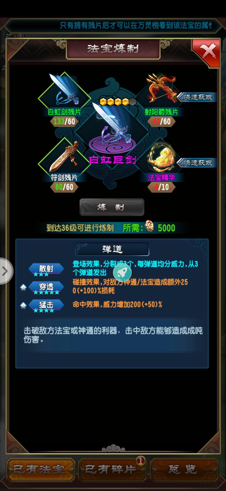 这个是重点章节,首先先普及一下法宝基础知识,法宝及其碎片产出基本有开箱子袋子 副本 地图小怪 各类商店基本都有 幻宫血色直接掉 任务活动以及历练获得。开灵期开灵期可以制作:白虹巨剑,巨龟盾,白骨巨锤,(这三个用箱子和坊市材料合成)火山飞叉。这几个就行了,其他法宝可以不用升星。开灵开青铜盒子刷法宝碎片主要就是刷巨龟盾,白虹巨,各种碎片刷150个。次刷白骨巨锤(先刷碎片,凝液巅峰再合)凝液