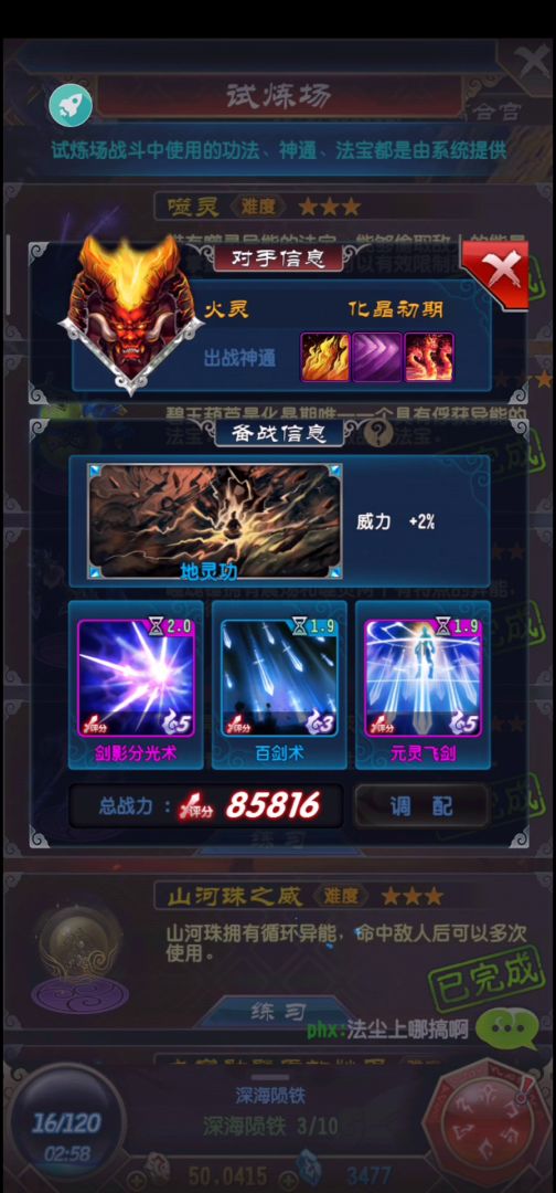 试炼地方在上界废墟上面第一关:对手放冰火琉璃剑你就放皇灵甲以免被增伤。16秒时举起国旗(烈焰旗)冲锋,丢辟地锤,17秒丢冰尺。咳咳,虽然尺子冻不住,但是赢了。第二关:神通选择天雷,浩气拳,乌鸦。对手起手斩灵剑不要害怕,让它斩,我们功法血龙,不怕不怕。等到对方放冰火琉璃剑时我们就放皇灵甲。11秒我们放凝光镜嗜血加速,接着对方右弹道放开天辟地,我们也不怕,因为浩气拳快出来了。当浩气拳和开天辟地对拼