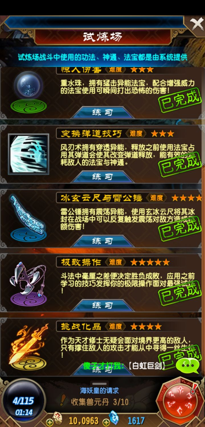【第一关】噬灵 只需要盯着能量看,等到能量一跳5的瞬间把玄阴针和金月剑同时从中间打出去,最后银空补个刀就可以结束了。【第二关】碧玉葫芦的使用技巧 神通搭配:元灵飞剑 雷网术 御剑术 通关打法:第7秒 让对面烈炎术打到身上以后再开火麟甲,对手放针的时候用葫芦吸掉,攒够能量就把玄阴针从右弹道放出,可结束。【第三关】噬魂锤的使用技巧 神通搭配:雷网术 百剑术 梦魇之瞳 通关打法:前面选择挂机,等第九