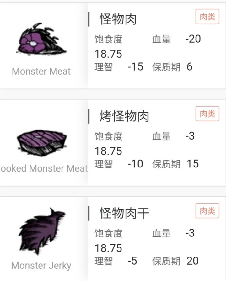 有的萌新还不知道食材和料理加的属性,萌新们不知道的帖子来了! ! !本期介绍食材篇话不多说,进入正题。一.肉类 ————————————萌新们不要问怪物肉烤了晾干可不可以吃了,除了做料理,不管怪物肉怎么吃都会减状态,只不过是减的多少而已,怪物肉有0.5肉类和0.5怪物,一般≥1,不加树枝等,就会出现怪物千层饼,减血减精神,做料理的小伙伴注意了。没烤过的鸡腿,蛙腿,大肉,小肉都不要直接吃,