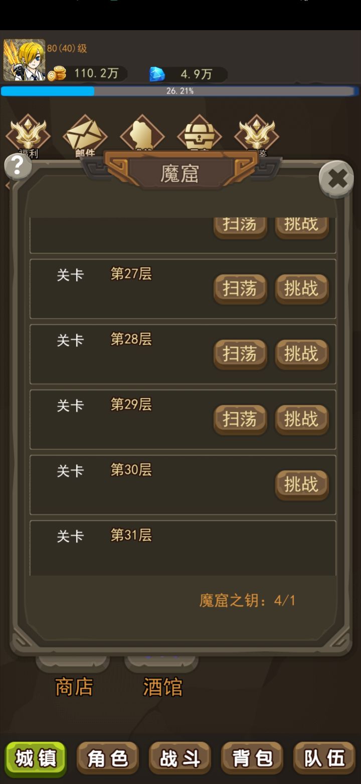 9.魔窟★★(非常重要),通关副本4-50开启,每层分小怪,中等怪,和boss,还有商店购买这里推荐前期买啤酒抽佣兵,和买神兽宝箱升星神兽,可以获得大量经验,产出主角装备和佣兵装备,圣器(80级可以使用圣器)宝箱,宠物随机宝箱,随机级别宝石,这里推荐大家可以攒着一些钥匙,80之后进行刷,层数越高收益越大。