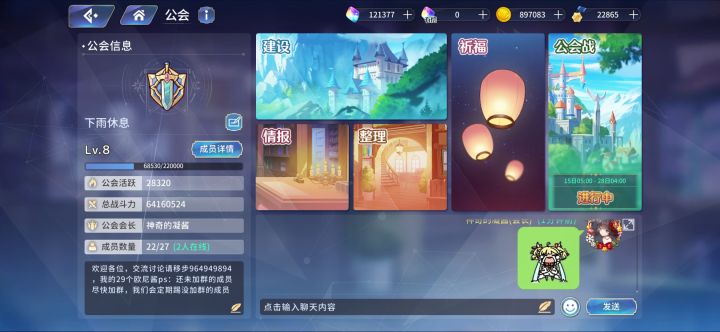 8级会下雨休息,现在少了5个人,上期我们公会排名124,这期可以保150的,要求不高只要战力有220w以上,上期积分有20w就行,公会战每日出完三刀,不摆烂就行,只求最好别超过三天不在钱,有意者可以加群