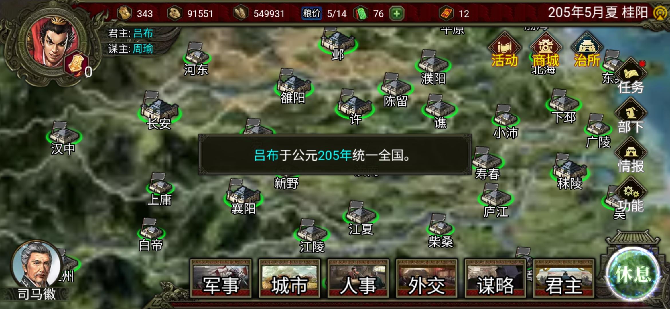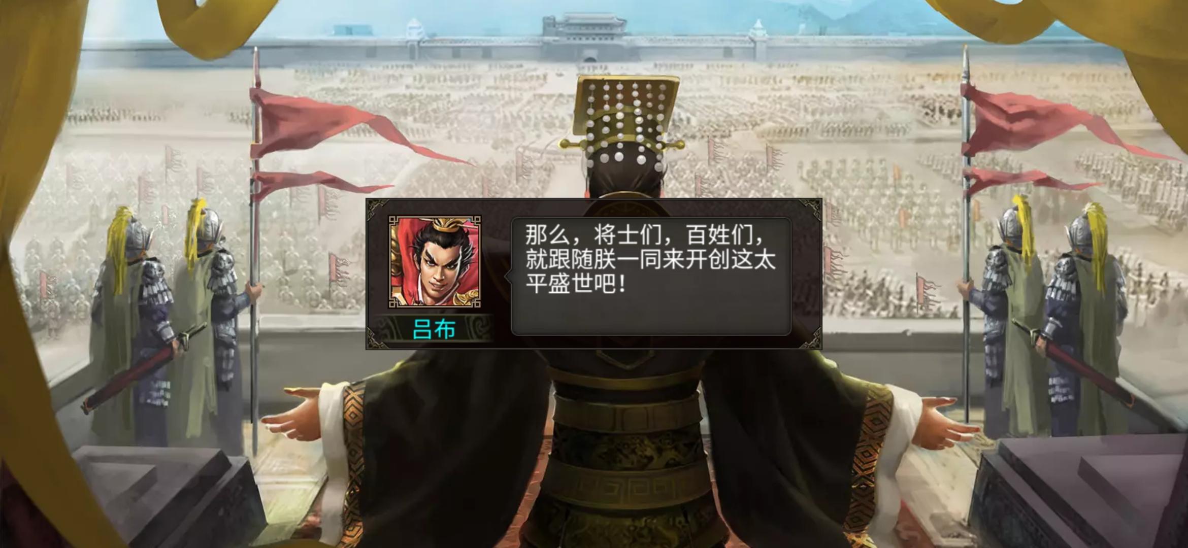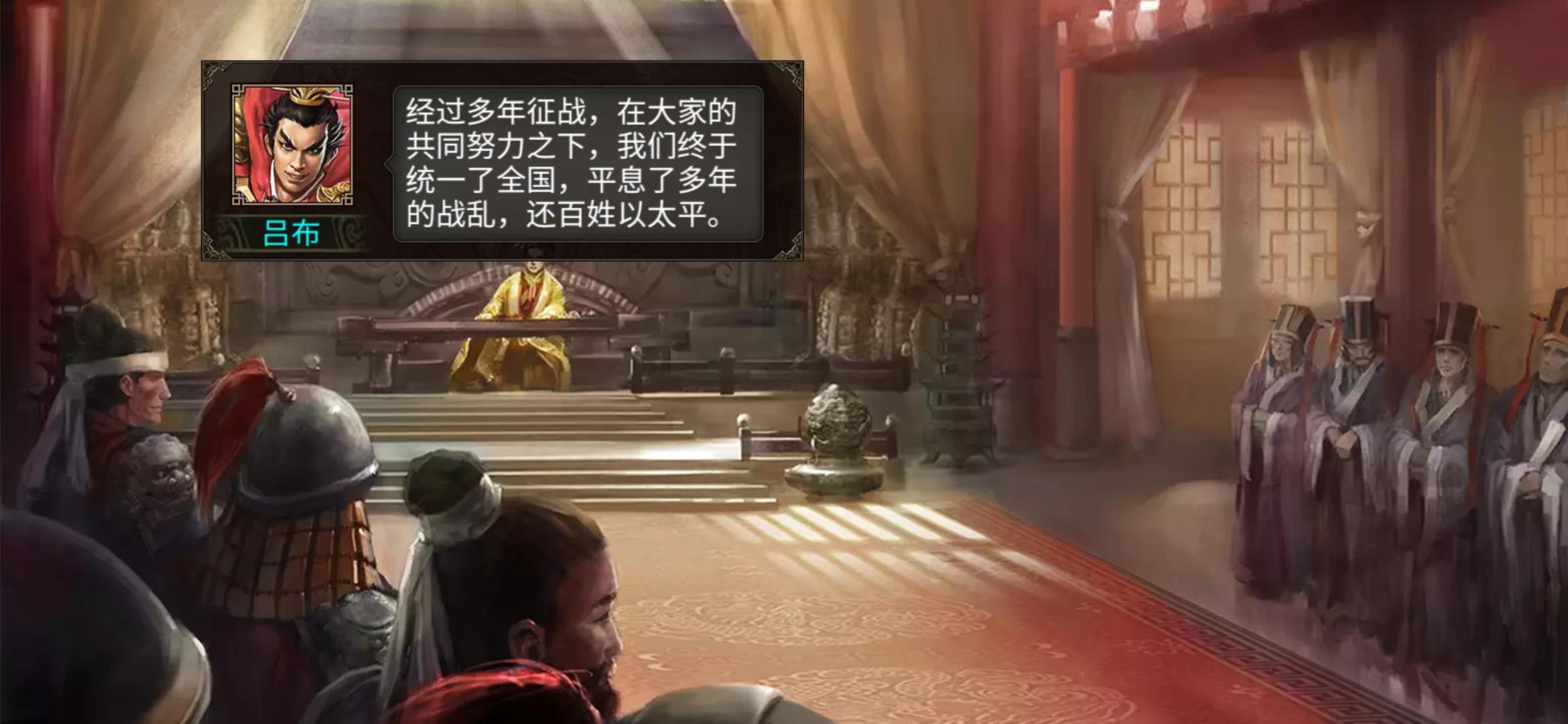 我吕布终于一统天下了吕布:大丈夫生当天地之间,岂能郁郁久居人下。我的目标是夺取天下成就大业。