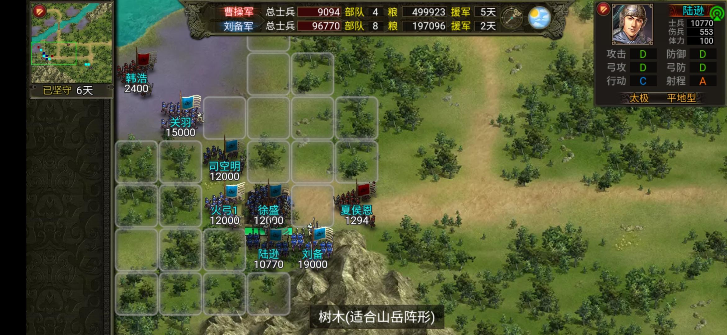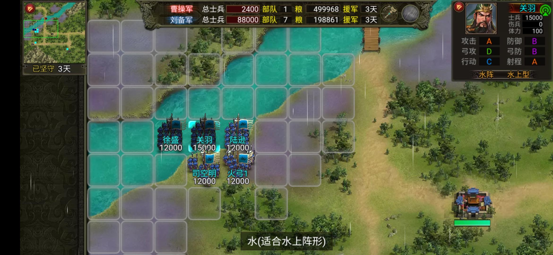 最后一波站位如图,铁憨憨敌人进小树林就奇袭工具人控一下,关羽的位置可以勾引憨憨进水挨打,其他人再这个防线后面射,慢慢磨,早晚给曹老板魔死,这里最最最关键的是憨憨敌人一定会优先攻城打徐盛😂,然后徐盛二级园阵且自带修复,伤害大幅降低,并且偶尔火箭一下点燃卡降低敌人属性进一步拉低输出(当然可以奇袭控住优先),就可以抗n个回合,反正我是十几个回合5000人没死,反正就徐盛抗其他人磨血,刘备看状态是否后退回两口血,状态好也可以分担一下伤害。就这样磨死曹老板。