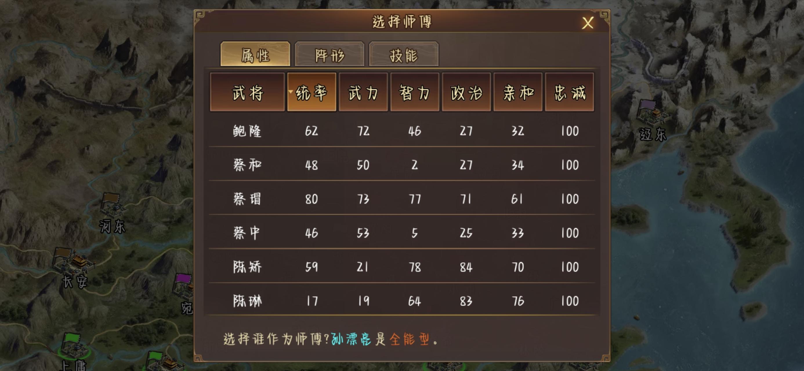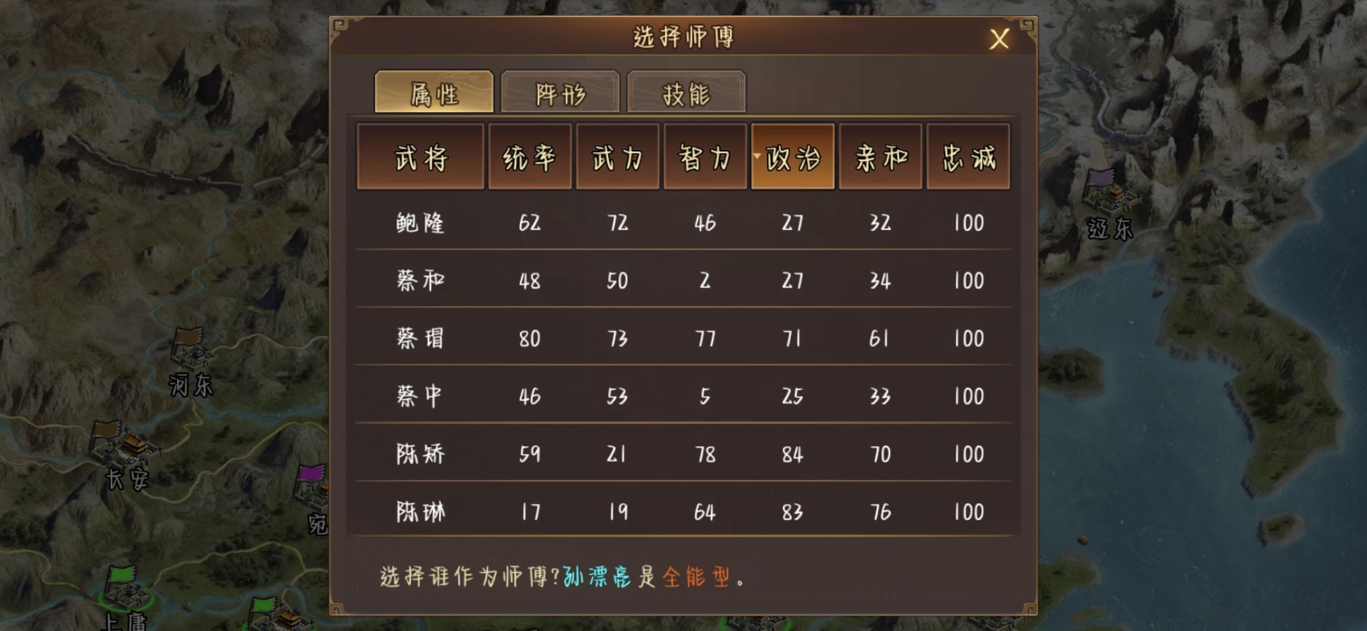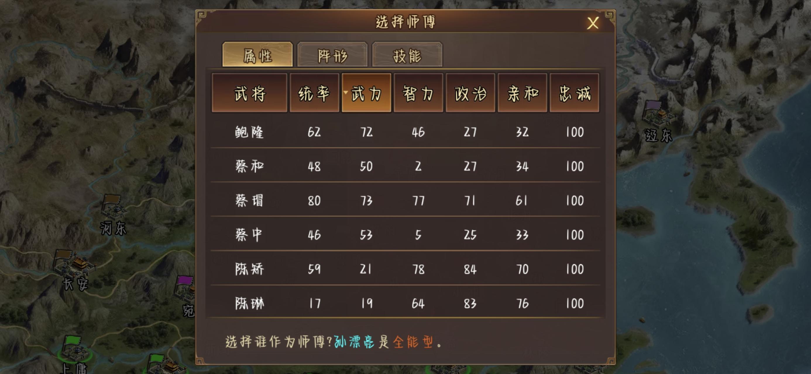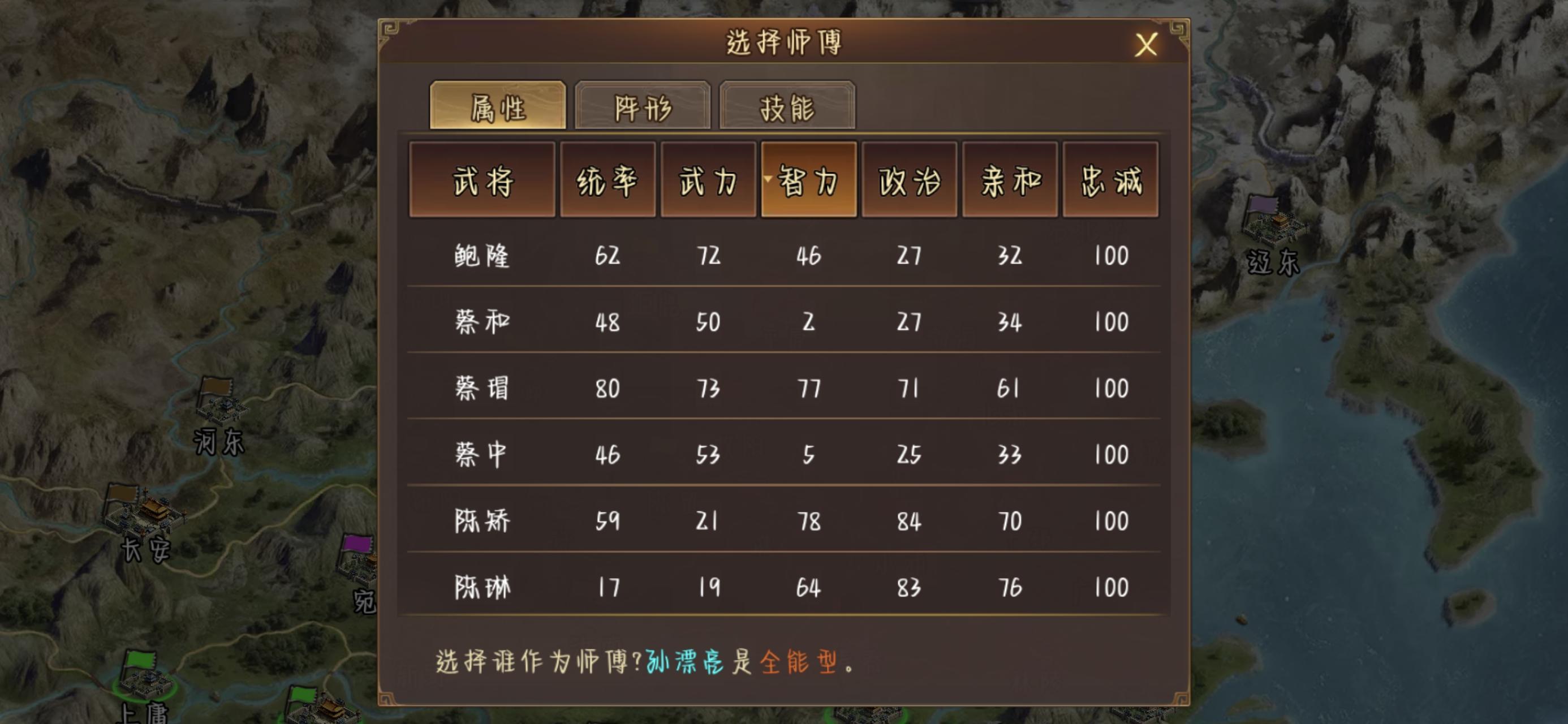 给子嗣选师傅的时候按武力/智力排序没用