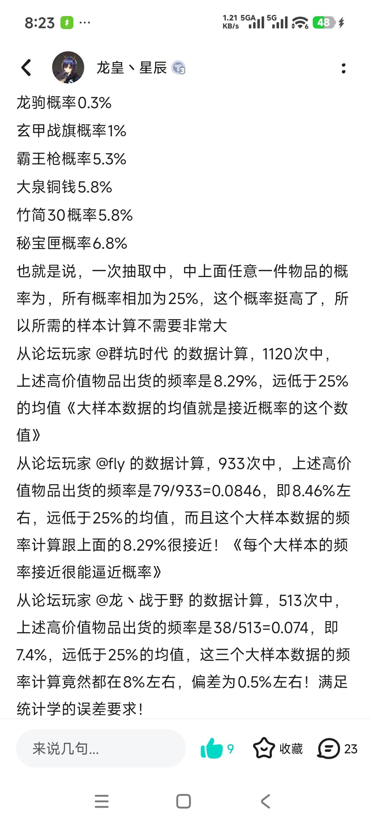 帖子内容来自于 @龙皇、星辰,因为官方总是在拿不沾边的内容重复问题删除玩家的质疑帖子,实在是看不下去,特再次转发抗争维权!#根据收集的统计数据,特别是几个大数据的样本进行分析,结果如下: 总计抽取数据:3039 抽到高价值物品次数:258 频率为:8.5%左右 因为公示显示高价值物品的概率有25%,这个概率很高了,收集的数据有三千多次,特别是有几个大数据样本分析,数据真实可靠无虚假,无故