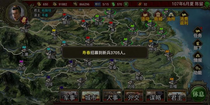 发现一个BUG,我征兵完了在寿春编成一结束,突然对面攻打我寿春。然后我选好了出战武将跳出BUG让我联系什么客服还是啥。直接回到初识界面。等我读档再操作一次发现没有这个bug了。打的是南北争霸剧本。
