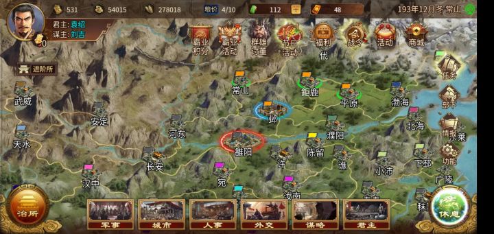 我觉得应我觉得应该开一些三国比较著名的战役作为即时对局,城池不用太多。十多个一张图。可以玩家VS电脑。玩家VS玩家。2 V2 3 V3都可以。半个钟到一个钟一局,随时随地撸一把。比如说汉中争夺战,赤壁之战等地图!君主势力:游戏里面所有的武将包括君主本身分为三个阵营即(刘,曹,孙。)刘势力可以录取刘,孙阵营武将,曹势力君主可以录取曹,刘阵营,孙势力可以录取孙,曹阵营1对局开始。每名玩家随机到一名