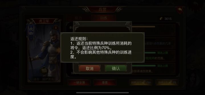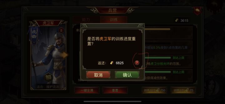 2.大部分新手玩家训练都是靠感觉来训练,新手就解锁西凉,护卫,小🐔,这三选一不就随便就训练了,为什么重置还要扣30%,本身这将令获取条件就苛刻,而且就算要扣也应该明显提示吧,这么小一个问号❓,谁注意?