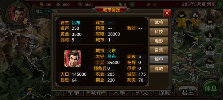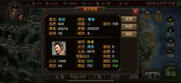 王侯开局34600的兵力灭六个城结果一次兵都没有征一路杀穿,官方说会加入多个自建势力是我对这游戏唯一坚持下去的动力了,也不知道什么时候会加入