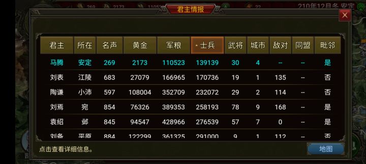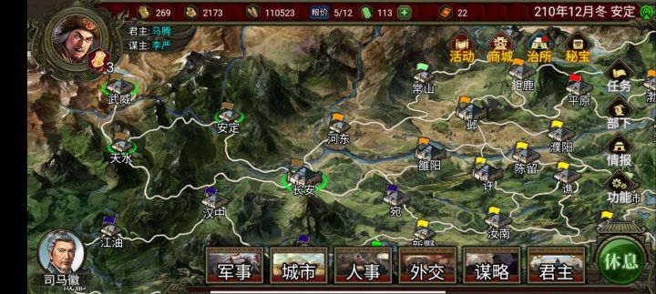 第一次看见这个游戏是因为儿时的霸王的大陆,果断下载了,刚开始玩简单,发现太简单了没意思,直接开了个困难,选的马腾,氪了连珠和援射,好家伙,刘焉这玩意一年打我一次,每次都是30多万打我10多万的,还好我技高一筹,三场战斗下来把他庞统和周瑜俩军师都给抓了,还有严颜,张任,李严,诸葛瑾都给抓了,直接逼到宛城了,哈哈哈哈。。