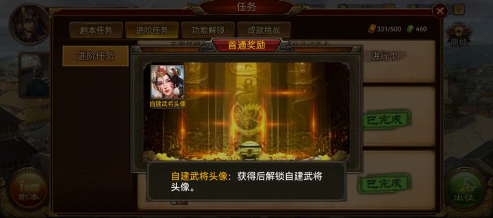 进阶任务里的奖励有自建武将头像,点进去之后就不能退出,也没有✗的按钮,点其他地方也不能退出这个界面,只能重新进,确认过没有卡机,网络也很好,这是bug吧