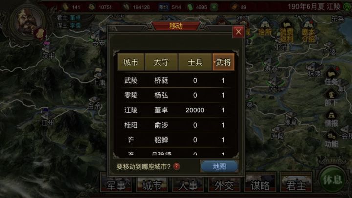 移动可以选本城武将执行以后相当于原地tp,武将行动会被占用,如果没研究科技的话应该还会减少体力