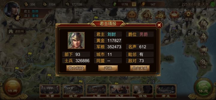 开了两次 选的史实 刘备都是222年2月挂 刘禅还没出 刘封接班 看着很不爽 刘备历史是224年挂的啊 历史上曹操挂在刘备前 但219年剧本都比刘备晚好几年才挂 顺便说一句 孔明每次开都是234年挂 太守时了 不喝酒延寿 儿子就学不到神算