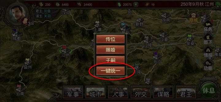 应玩家多次呼吁,在我们谨慎评估后,决定于今天更新两个重大功能:一键统一:如图所示,在君主-君王菜单中,将增加“一键统一”按钮,当点击按钮并确认后,游戏即将结束,进入统一画面。另外,三妻四妾功能已经测试完毕,即将实装。细心的玩家应该早就看出来,我们在这里预留了多个妻妾的栏位。现在,每个武将最多可以娶3个配偶,君主因此可以获得9个子嗣。以上两个功能均已在内侧服更新,有内测权限的主公们可以