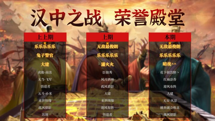 大大们下午好~本次汉中之战也在激烈的角逐中落下帷幕,一起来看看本周榜上有名的大大们吧!接下来是排名靠前大大们的详细分数:荣登榜首的大大是 无敌最俊朗 军团,恭喜!无敌最俊朗 军团配置的武将有:张郃、公孙瓒、吕布、夏侯惇、诸葛亮、陈到、马腾和三位自建武将排名第二的大大是 乐乐乐乐乐 军团乐乐乐乐乐 军团配置的武将有:张郃、关羽、马腾、黄忠、吕布、诸葛亮、陈到和三位自建武将排名第三的