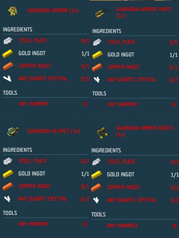 本期导读:前面讲解了武器的制作及技巧,本期来说说关于游戏里铠甲的制作。本期攻略将选取几个有代表性的铠甲为大家进行说明。游戏中的铠甲属于服装系统的一部分,但同时铠甲也带有防御力,抵御来自野兽的攻击。不同的铠甲有着不同的防御力和外观,这篇攻略着重选择几种铠甲套装来进行说明。几种铠甲套装外观以及制作配方守护装甲套,防御力35点,外观以及配方如下图:衣服:5个钢板、1个金锭、1个铜锭、5个任意水晶