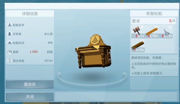 各位亲爱的岛主:欢迎来到《艾兰岛》。本期攻略,小艾将教各位萌新岛主自己动手修复船只!再也不用担心轮船会沉没海底了!【如何查看船只受损度】最简单的办法是直接查看【轮船导航表】,在这里会详细记录船只的当前状态。所有者、轮船状况、速度、海水深度等等。当然,你也可以制作【船体完整性计量仪】将其摆放在比较明显的位置,随时进行查看。【修复船只需要什么材料】一般情况下,修复船只需要准备【修复锤子x1