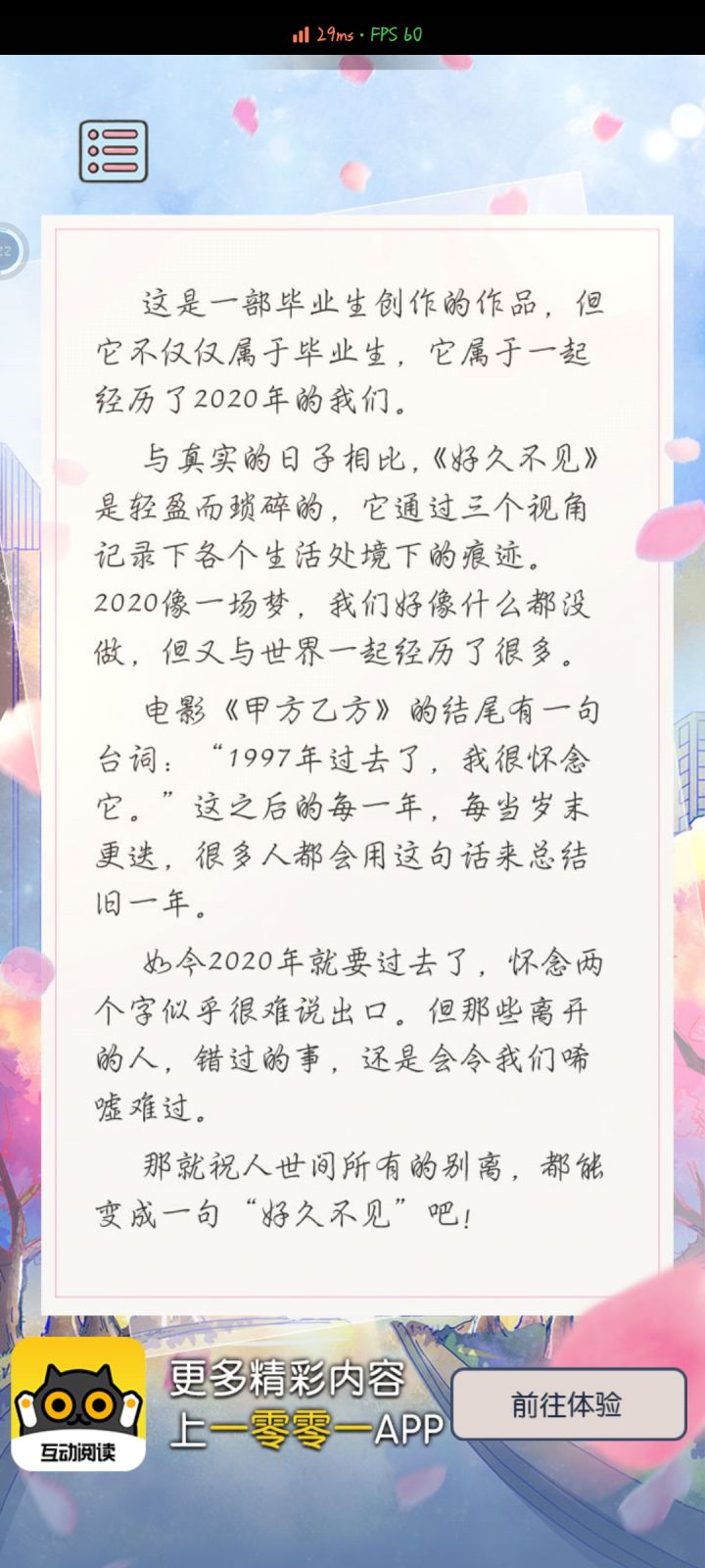玩yx可以看出作者大大很用心,第一章的主视角是记者齐琳和是程医生里面(小恐龙),主要讲了医生抢救病患,主故事线是3号床73岁的一位大爷的故事(这里我就不剧透了😂😂想看的可以自己去玩yx)真的特别的感动,我都看哭了,可能是看不了生离死别明明走向了比较好的道路,最后是满怀希望的离开,真的特别受不了这样的。