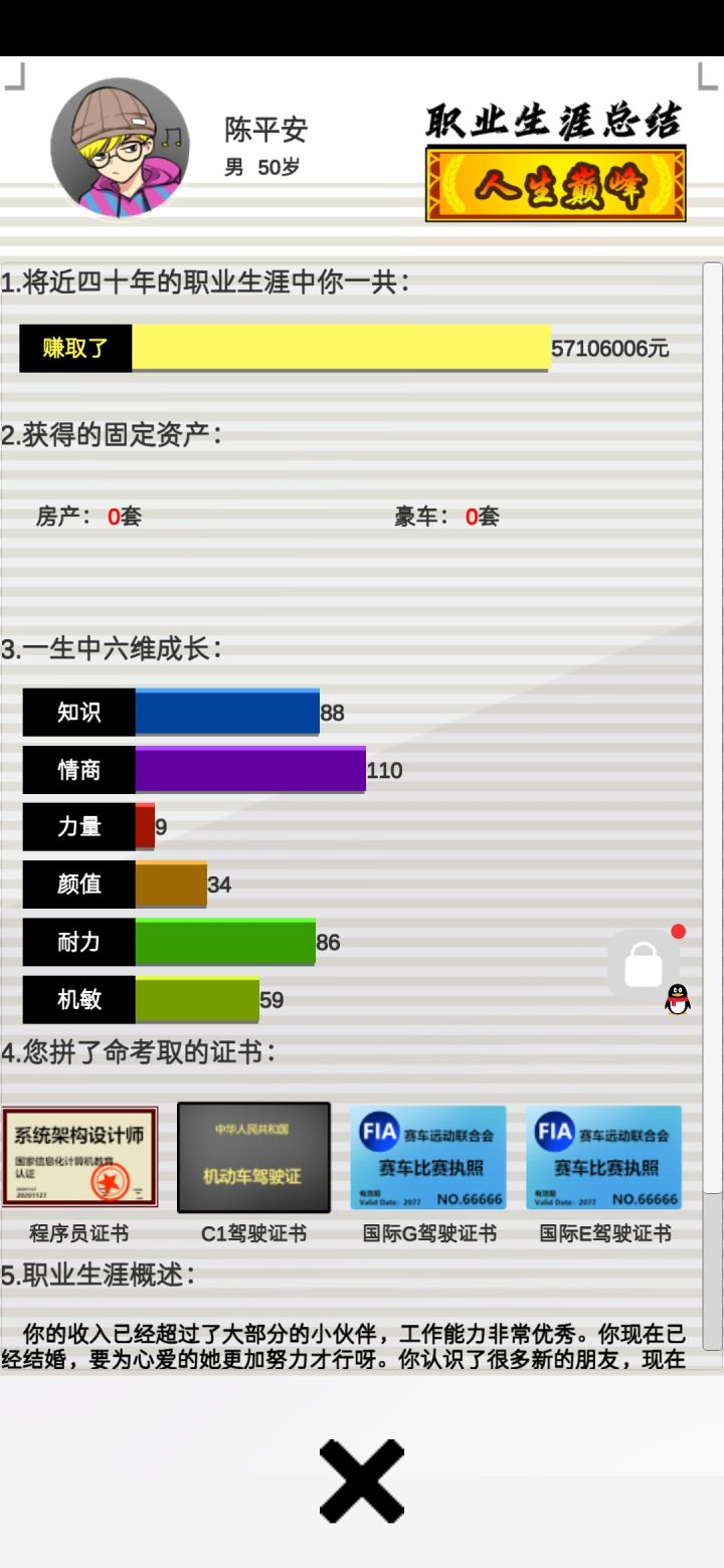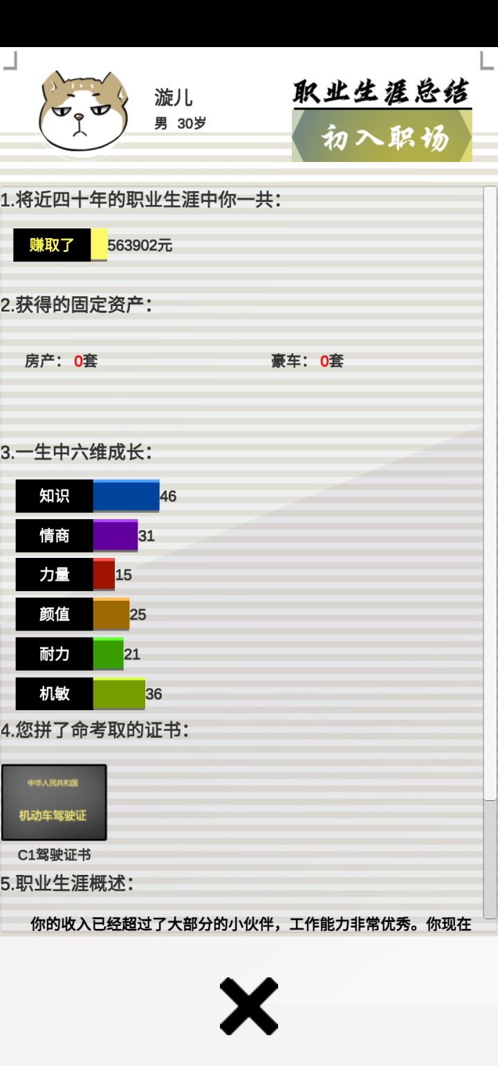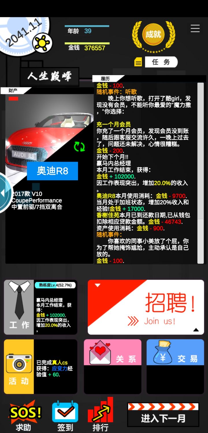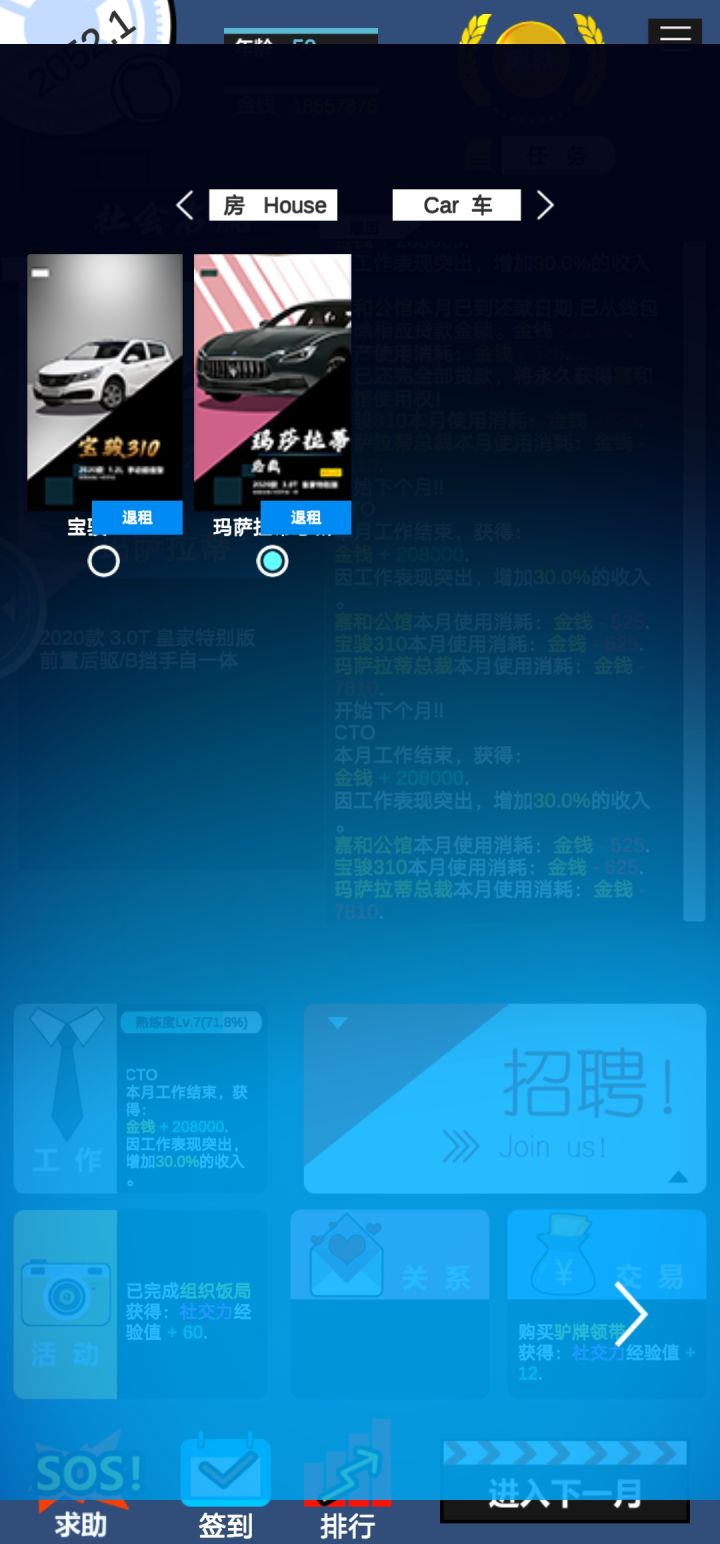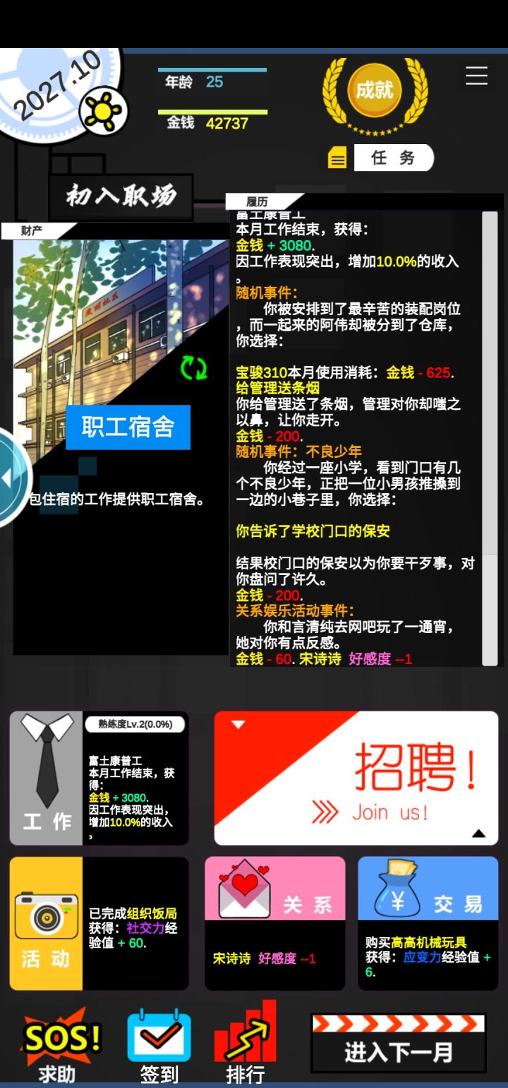 1:活动的数值是固定的,建议随活动等级以及人物各项数值变化,活动其实也可以花点钱的。2:房租和每月开支太少了,没有代入感。3:结了婚以后没有生娃的功能,生了娃之后的一系列开支加进来肯定能够提高游戏可玩性。