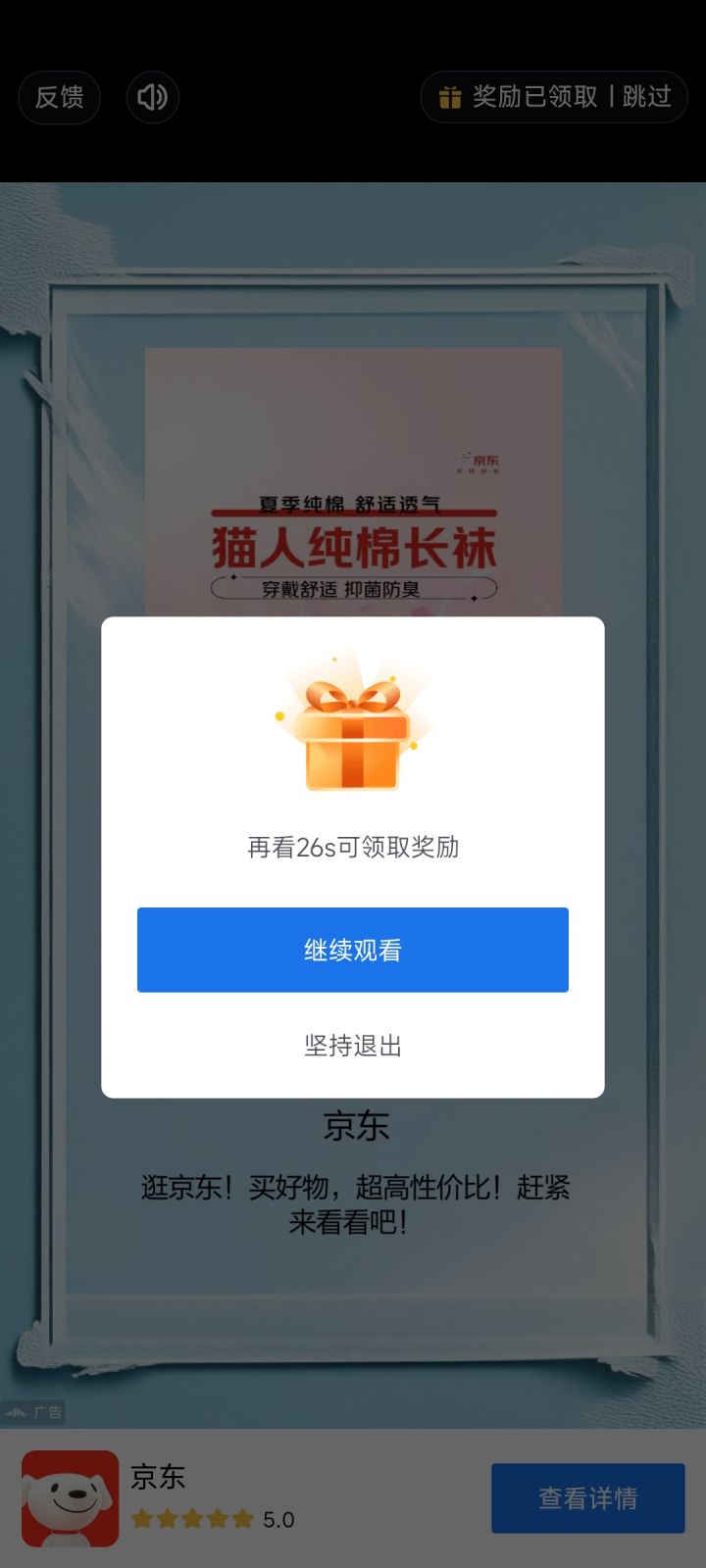 这个广告需要等五秒然后点进去再退出,此时显示“奖励已领取”但仍需要等26秒(或20秒),这个26秒是没有倒计时的,需要点“跳过”查看剩余时间,如果点“跳过”看到的时间固定为22秒则需要再点进去一次退出才会从26秒开始计时,可谓是恶心之至,而且出现概率极高。我在别的游戏遇到过寻道大千和次神的“玩15秒小游戏”广告,也很恶心,但出现概率偏低;你游另一种寻道大千和喜果壁纸广告会在剩余25秒时显示“跳过”
