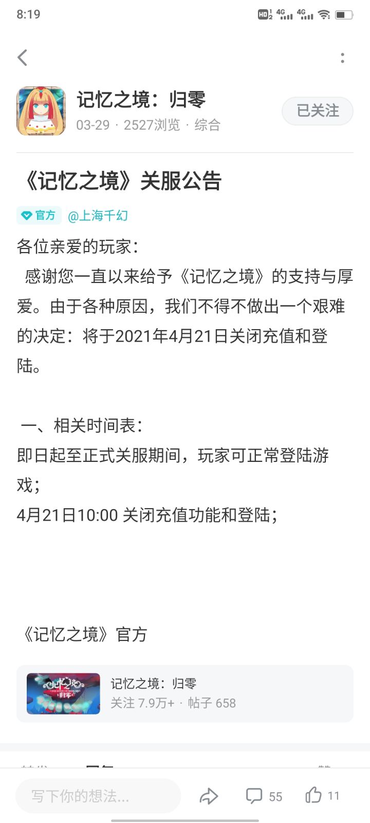 不知道还有没有人会看到这条消息,挺遗憾的游戏居然关服了,我高中的时候开始玩的,后来因为高考就没有再玩了,中途换了几个手机,现在大学刚毕业,没想到居然关服了,挺遗憾的吧,毕竟是从测试就开始玩的游戏。研发团队非常棒的,每一个场景都特别美,给我一种治愈的感觉,虽然我的力量很小,但是我玩这个游戏的历程会一直留在我的记忆里,不是没有人记得你们,以后的路也要加油呀!!!期待未来你们做出更好的成绩。(一名普普通