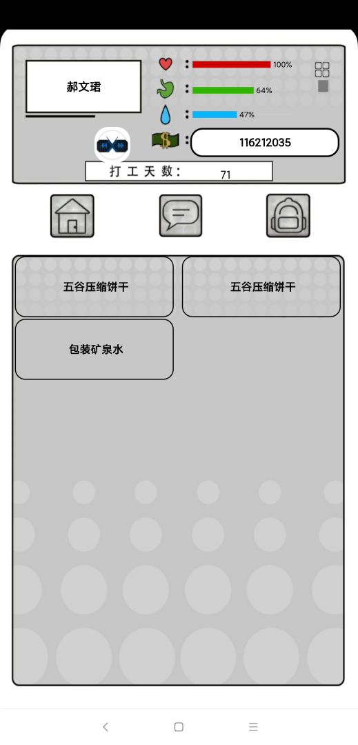 游戏性还可以,就是过于简陋,食物显示不够详细,吃什么,多少钱,补多少?一个用一行小字放旁边不舒服吗?背景能不能多几个,优化一下,等待时间不超过5秒,顺便放个小广告上去,我舒服你也赚钱,然后,打工等待时的重点,你要放一个表达在工作的动态图啊,干等很烦躁的。