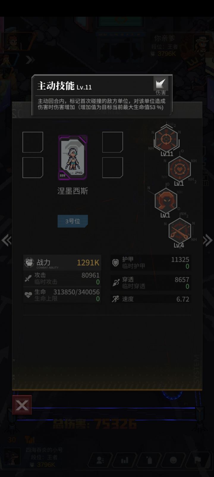 今天打十二连胜的时候发现了一个非常神奇的事情涅墨西斯主动技能标记敌人后,造成伤害会活动伤害增加,而这个伤害却不仅限于碰撞伤害,也就是说第一下撞到胖子,第二下撞到其它人,胖子分担的伤害也会附带这个最大生命值伤害,可以说非常强力了,不愧是氪金角色,要是巅峰里配上混乱敌方持续追击我感觉一回合能把对面胖子干掉