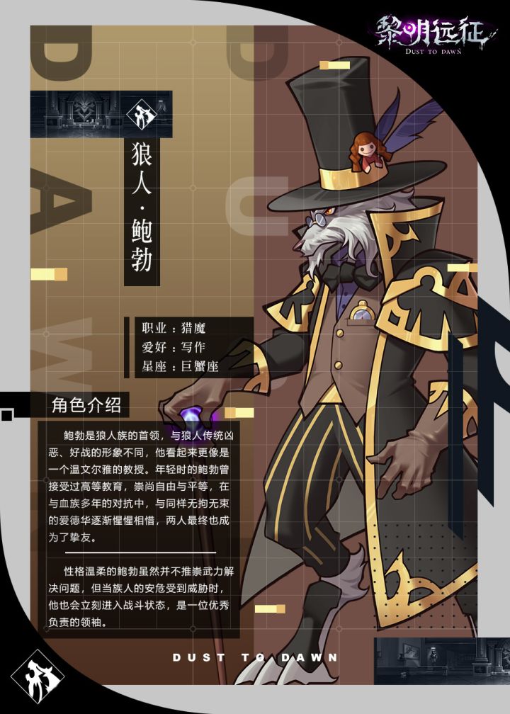 ▌狼人族-猎魔-鲍勃“都什么时代了,不要总急着动粗”(狼魂突袭技能展示)指挥官大人们好呀~!今天塔妹为大家带来了狼人族首领——鲍勃的一手资料!有着儒雅气质的鲍勃擅长法术攻击,作为领袖,他超越常人的判断力也常常能令小队因此获胜呢!1技能:狼魂突袭鲍勃释放狼魂之力对场上所有敌人发动冲击,狼群可造成5次法术伤害群体攻击2技能:针锋相对每两次普通攻击后会针对最近的目标进行一次攻击,造成法术