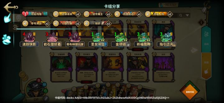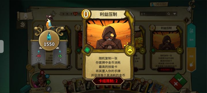玩了几天,游戏很有趣,胜率也不错,现贡献下我的炼金卡组deckc-AAECz9JPDwMLCxcXJCQlJSc2ObgBuQGsAgoDAw4TGz9bW2tr优点:1.不吃岛,适合懒人,不用费心纠结是红黑绿岛,完全不靠分配,全部自产金币,专注产钱100年。2.强化生存,基本全程都带着持续3回合的盾,再加上有持续3回合的回血茶,让你能比其他人坚持时间更久,活到最后就是胜利。✌缺点:1.输