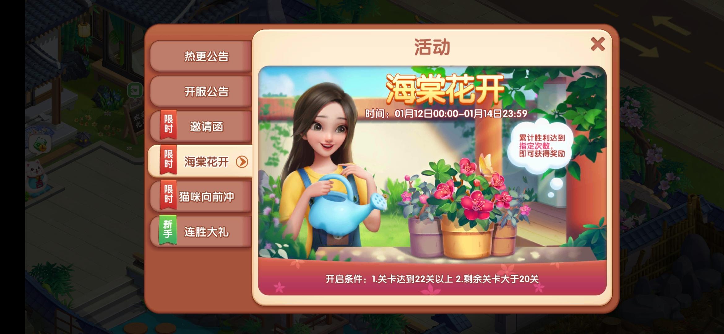 为什么我没有这个海棠花的活动,也没有过奖励?我都64关了?